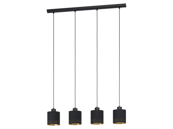 Hanglamp Esteperra van Eglo is een moderne plafondlamp met zwarte lampenkap uit textiel en gouden binnenkant. Perfect om een gezellige sfeer te creëren in je woonkamer of eetkamer. De geperforeerde details in het goudkleurige staal zorgen voor een prachtig lichtspel. Plafondlamp Esteperra is beschikbaar in diverse uitvoeringen.
