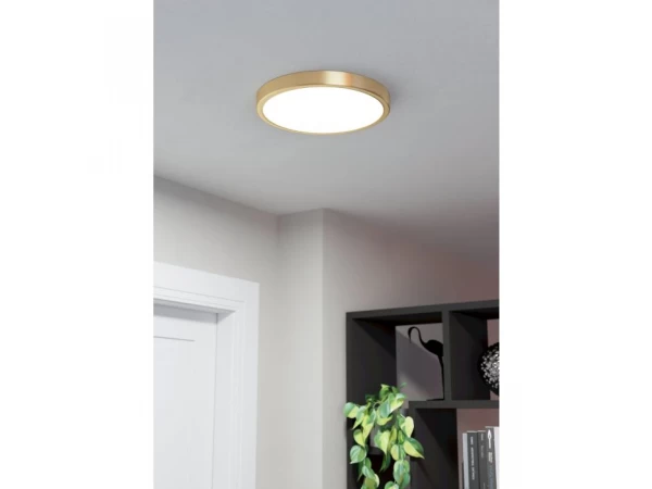 De Fueva 5 van Eglo is een moderne plafondlamp. De armatuur is geelkoper-geborsteld en bestaat uit staal en kunststof. De omranding heeft een gouden finish en maakt de lamp meteen wat sprankelender. De Fueva 5 is ook nog in een groter en kleiner formaat beschikbaar.
