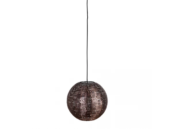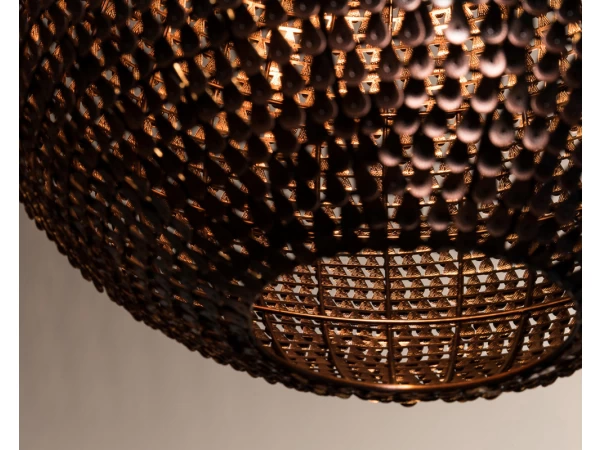 Deze sprankelende hanglamp bestaat uit honderden kleine stukjes koper, die worden gebrand voor een gevlamde look.