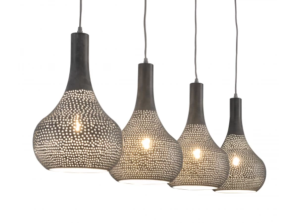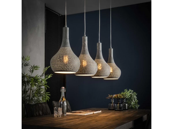 Deze 4-lichts hanglamp, inclusief de plafondbevestiging, is uitgevoerd in grijs of zwart/bruin metaal. De kegelvormige lampenkappen zijn volledig handmatig geperforeerd, waardoor elke lamp uniek is. De gaatjes maken het model semi-transparant, waardoor het licht sfeervol wordt doorgelaten. De lamp is verder voorzien van kabels van textiel. Gezien de afmeting van deze lamp, past hij perfect boven een middelgrote eetkamertafel.