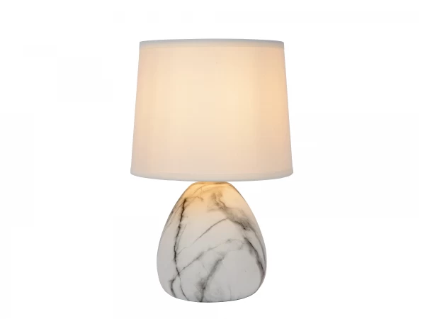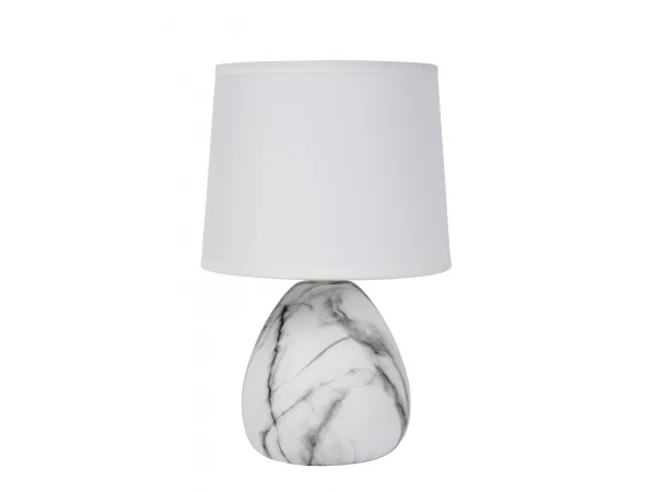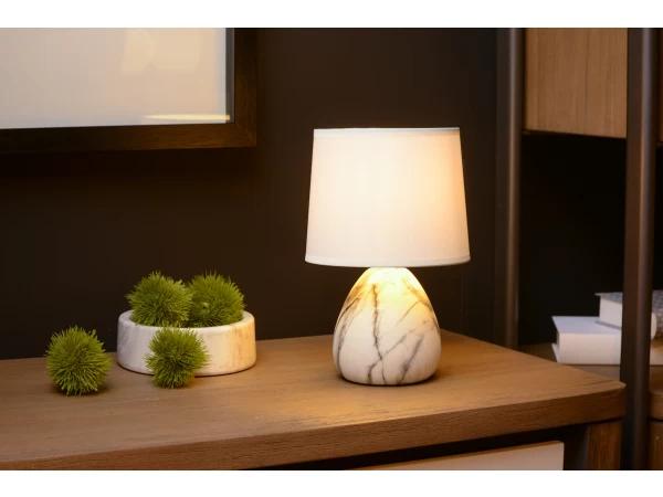 Tafellamp Marmo van Lucide is tijdloos en elegant. Met een marmeren look geef je je interieur instant dat extra cachet. Met deze keramische tafellamp bekom je hetzelfde effect. De linnen kap vangt het licht en creëert een speelse schijn op de donkere nerven van de poot. Op een tafel, commode, bureau of open wandkast, tafellamp Marmo steelt in elk interieur de show. Hij laat zich in een vingerknip aan en uit zetten met een schakelaar op het snoer. Ondanks zijn bescheiden taille van 26 centimeter hoog en een body van 16 centimeter breed brengt Marmo de nodige grandeur in huis.
