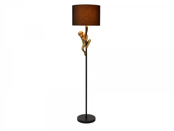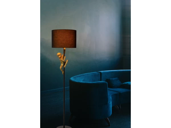 Een moderne interpretatie van een klassieke vloerlamp pimpen? Dat doet dit aapje met plezier. Deze staande lamp uit de reeks Extravaganza Chimp brengt een speelse knipoog in je interieur. Of je nu klassiek of hedendaags woont: hier komt de aap uit de mouw. Het lichtpunt is omgeven door een katoenen lampenkap, voor een warme uitstraling. De lamp verspreidt aantrekkelijk licht. Niet te verwonderen dus dat de kunststoffen chimpanzee er als een volleerde acrobaat gretig naartoe klimt. Dat doet het beestje via de metalen staaf, die zich vanaf de voet uitstrekt tot op anderhalve meter hoogte. Na het inpluggen zet je de vloerlamp eenvoudig aan of uit via de schakelaar op het snoer.